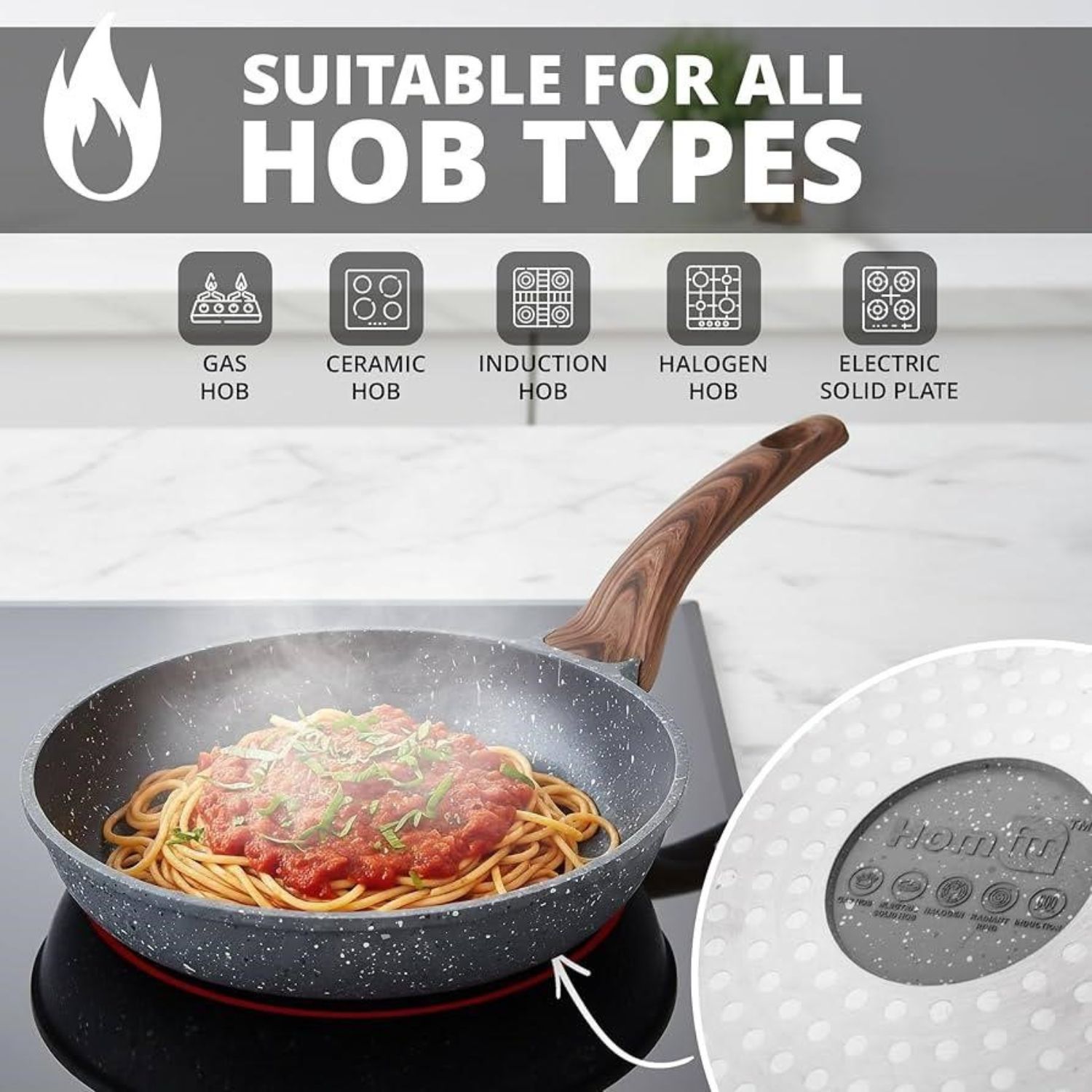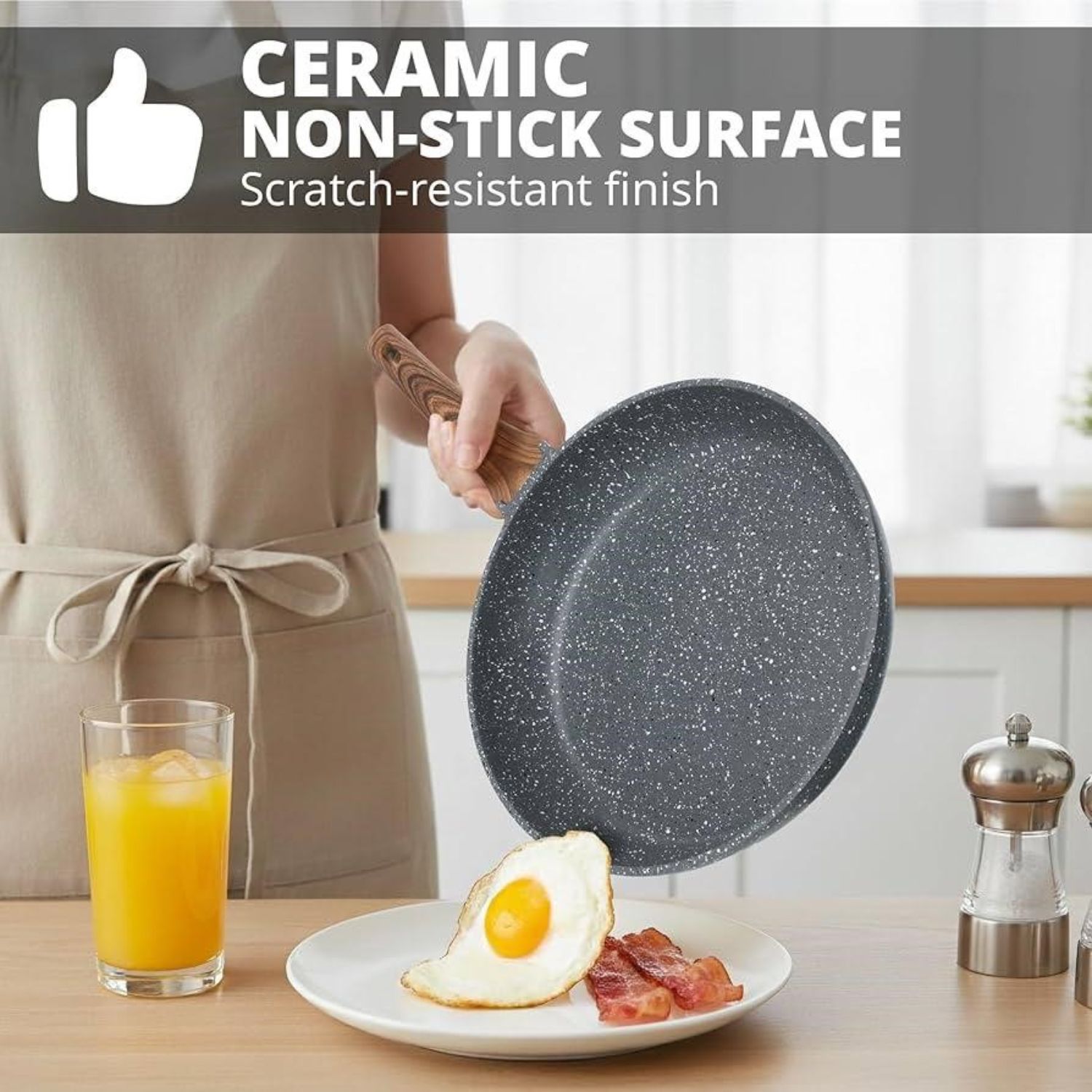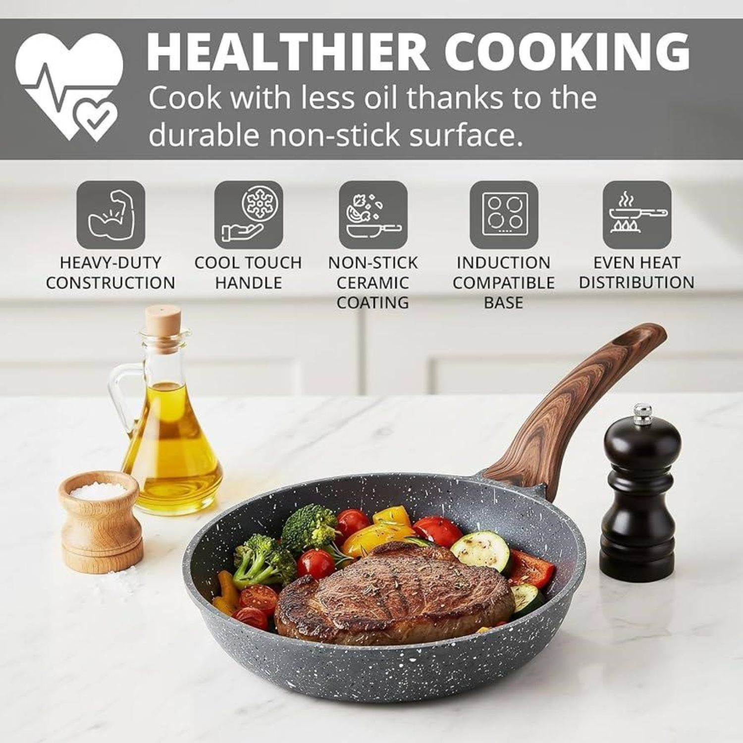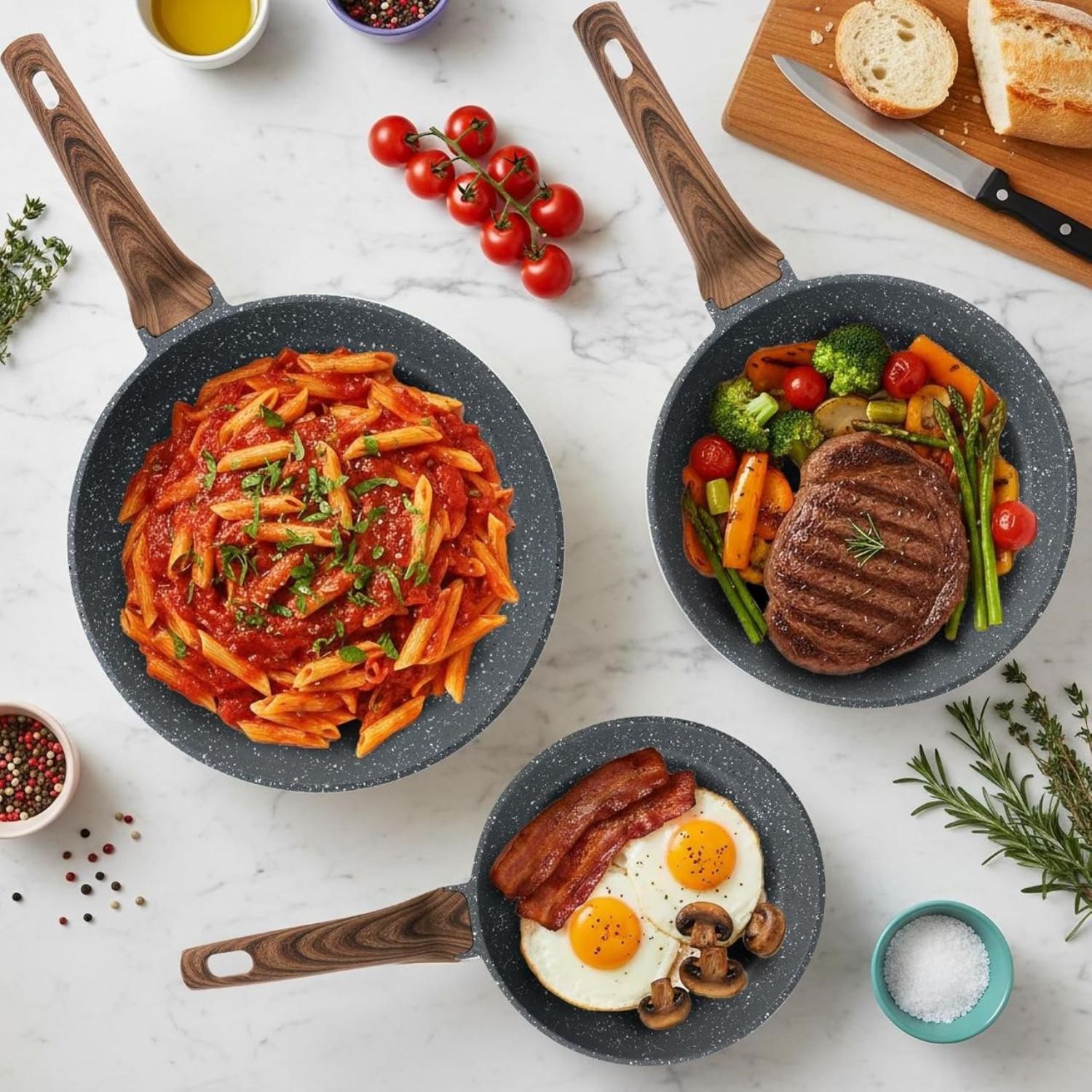Each pan features a high-quality non-stick coating that allows you to cook with less oil or fat, helping you prepare healthier meals while preventing food from sticking. The pans are engineered for fast and even heat conduction, ensuring your food cooks quickly and evenly for better results.