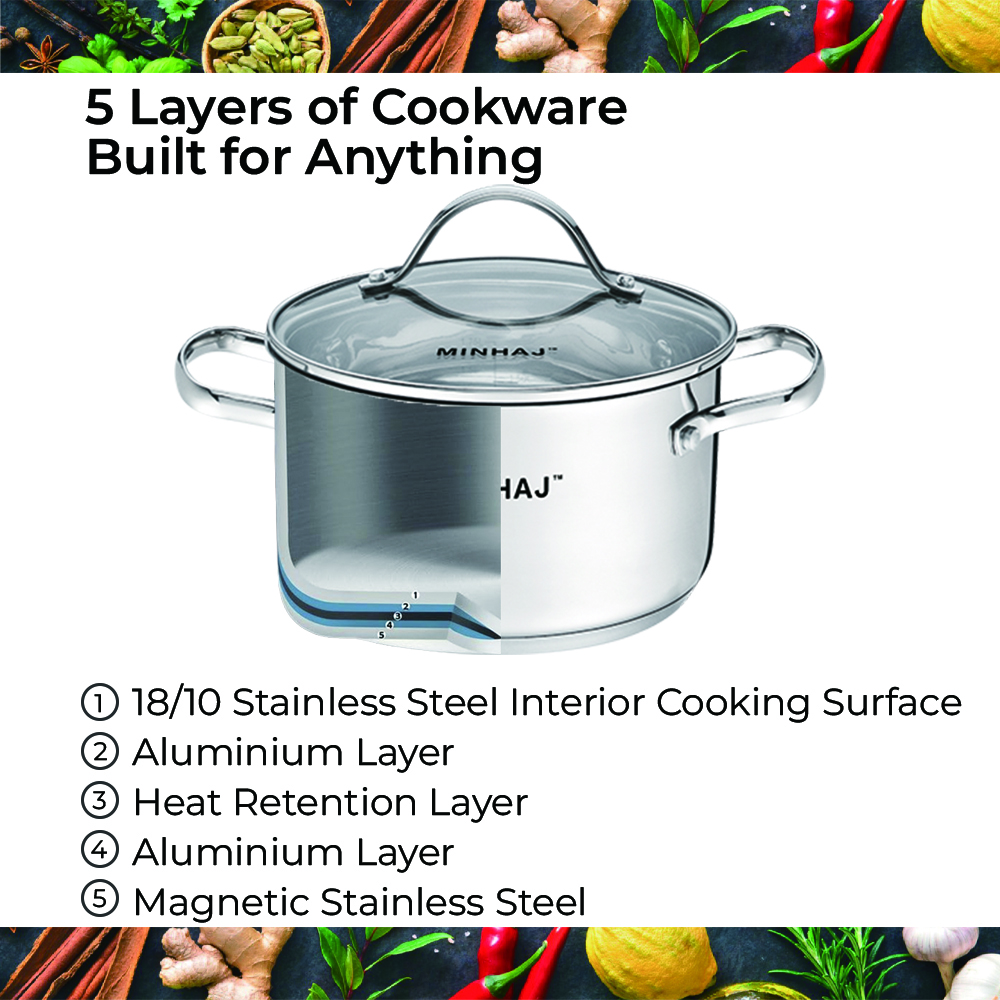 Upgrade your kitchen with the Minhaj Homeware 7 Piece Stainless Steel Cookware Set, designed for durability, performance, and everyday cooking convenience. Made from high-quality 5-layer stainless steel, this cookware set ensures excellent heat distribution and fast heat conduction, helping you cook meals evenly and efficiently.