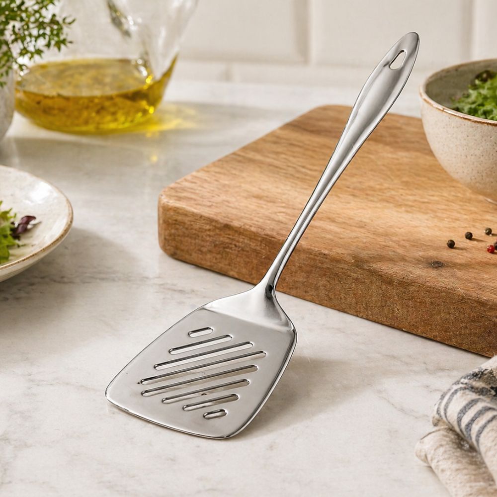 The slotted design allows excess oil or liquids to drain easily while flipping or serving, perfect for pancakes, burgers, fish, and more. Its ergonomic handle ensures a comfortable grip, and the polished stainless steel finish adds a sleek, professional touch to your kitchen. Dishwasher safe for easy cleaning, it combines practicality with style.