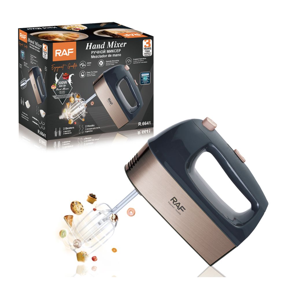 Equipped with 2 beaters and 2 dough hooks, the RAF R6641 is perfect for mixing cake batter, whipping cream, and kneading dough. Its practical design ensures convenience, making it ideal for home baking and cooking.