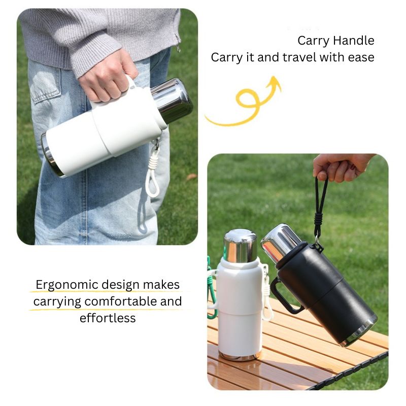 This versatile flask comes with a 316ml tea strainer, perfect for brewing loose-leaf tea on the go. A side handle and carry rope strap make it easy to transport, whether you’re commuting, hiking, or enjoying outdoor activities.